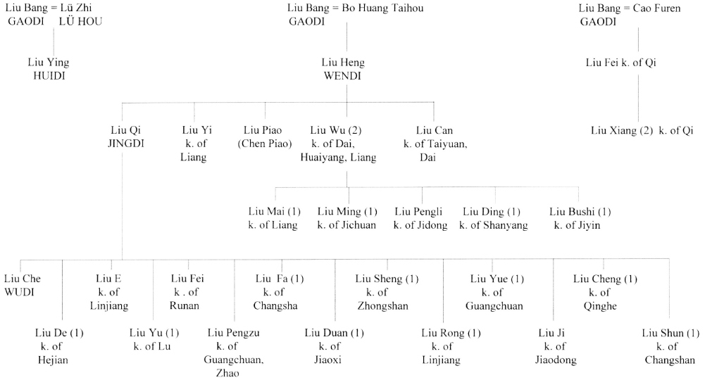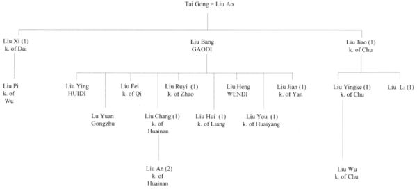 Liu Xiu (2), the first of the Later Han Emperors, traced his descent directly to Liu Fa (1) and thence to Liu Bang.